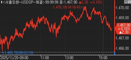 Intraday, the high was 1,470.10 won and the low was 1,465.70 won, for a trading range of 4.40 won.