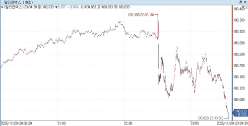 According to Yonhap Infomax (screen number 6411), as of 09:32 AM Eastern Time on the 20th, the US Dollar Index (DXY), which measures the greenback against a basket of six major currencies, stood at 100.054, down 0.136 points (0.136%) from the previous close of 100.190.