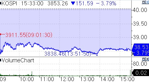 According to Yonhap Infomax’s New Stock Composite (screen number 3536), the KOSPI plunged 151.59 points, or 3.79%, to finish at 3,853.26 on the 21st, marking its steepest decline in recent weeks.