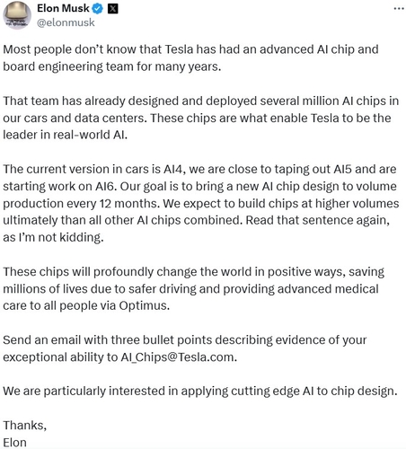 He added, “This team has already designed millions of AI chips, which have been deployed in Tesla’s vehicles and data centers.”