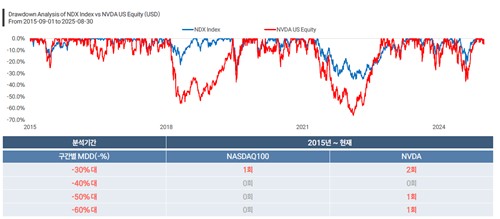 Bae also advised against investing in individual stocks. Since 2015, the Nasdaq 100 index has experienced a maximum drawdown (MDD) of over 30% only once, but Nvidia Corp. alone has seen four such events: twice over -30%, once over -50%, and once over -60%.