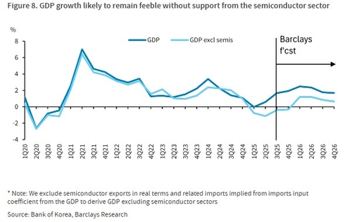 Barclays forecasts South Korea’s GDP growth at 1.1% for this year and 2.1% for next year. Excluding semiconductors, growth is estimated at -0.7% in 2025 and 1.1% in 2026.