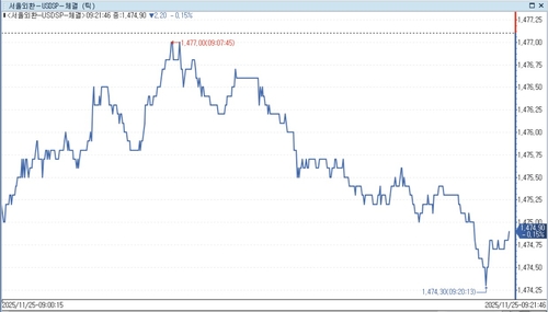 As of 09:22 KST on the 25th in the Seoul foreign exchange market, the dollar-won rate was trading at 1,474.90 won, down 2.20 won from the previous session.