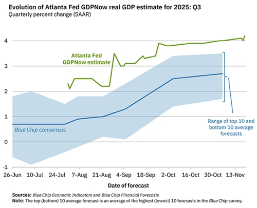 According to the Atlanta Federal Reserve’s ‘GDPNow’ model, as of the 21st, the third-quarter growth rate is projected at an annualized 4.2% quarter-on-quarter. This figure is more than double the Federal Reserve’s estimated potential growth rate of 1.8%.