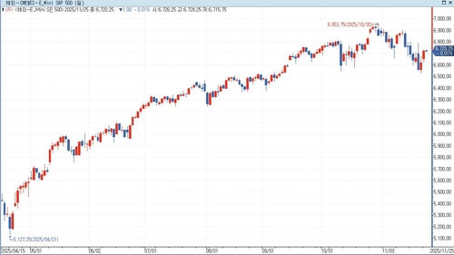 According to the Yonhap Infomax Index Futures Integrated Screen (Screen No. 6520), as of 10:20 AM KST, E-mini S&P 500 futures were down 0.01% at 6,720.25.