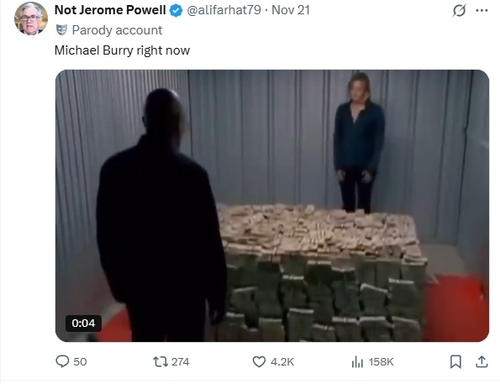 Another account shared a video of a man standing before a mountain of cash, captioned “Current Michael Burry.”