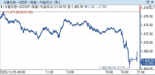 As of 21:42 KST on the 25th in the foreign exchange market, the dollar-won rate stood at 1,465.50 won, down 11.60 won from the previous session.