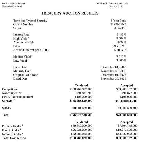 In the secondary market, the 5-year Treasury yield briefly dipped following the auction results released shortly after 13:00 in New York, but quickly rebounded to levels seen just before the auction.